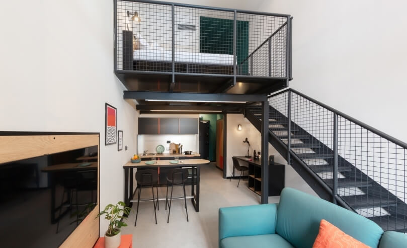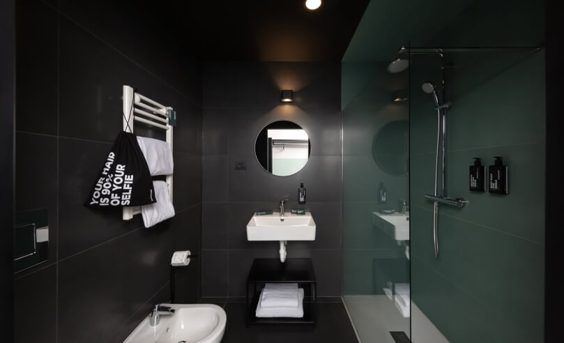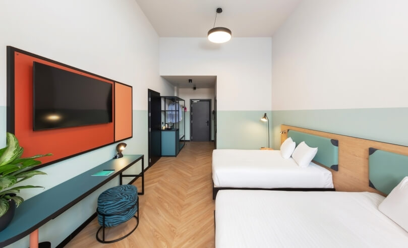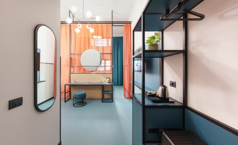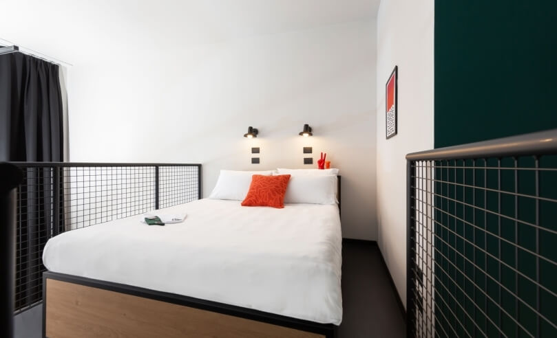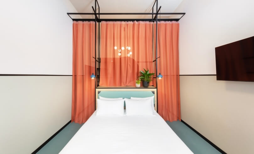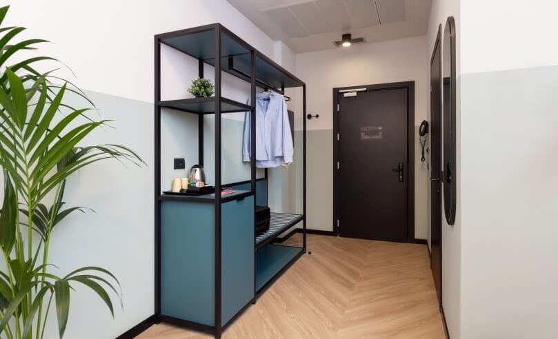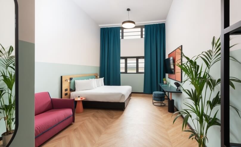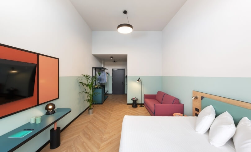 The ideal solution for those seeking a peaceful stay after a day in the urban jungle. Inside, you will find an open wardrobe with a minibar, coffee station, smart TV, and a safe box. Bonus point: the queen bed (180x200cm) comes with a Simmons mattress. Double space, double comfort.