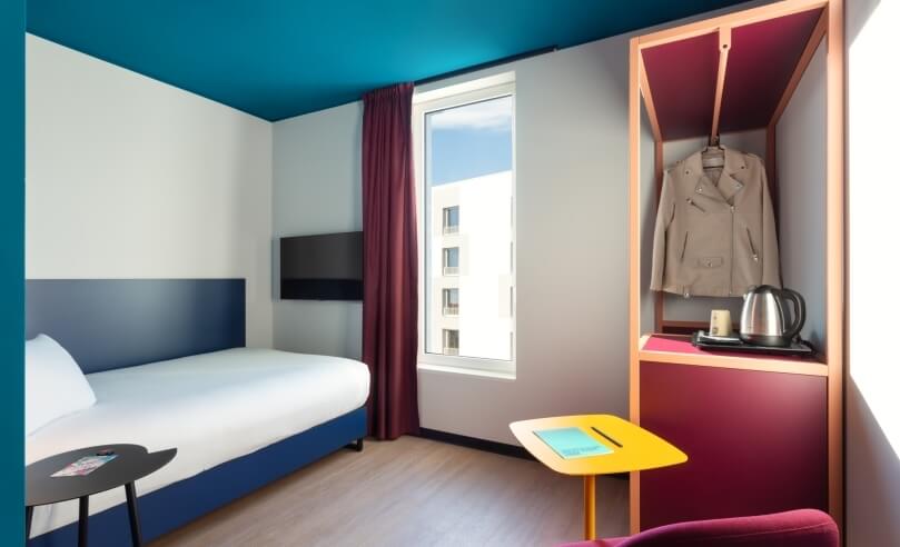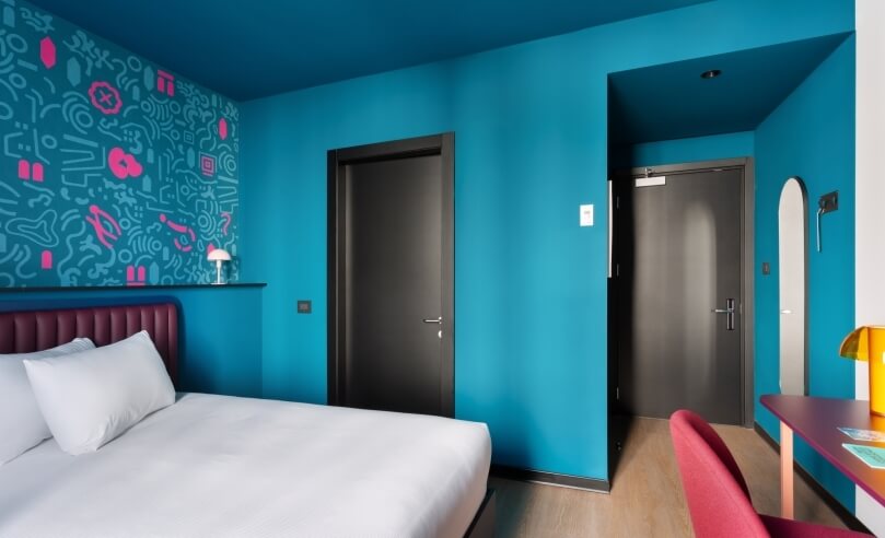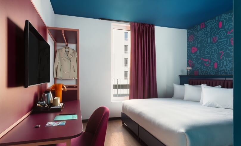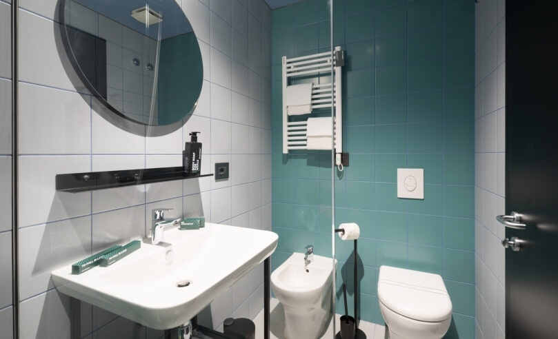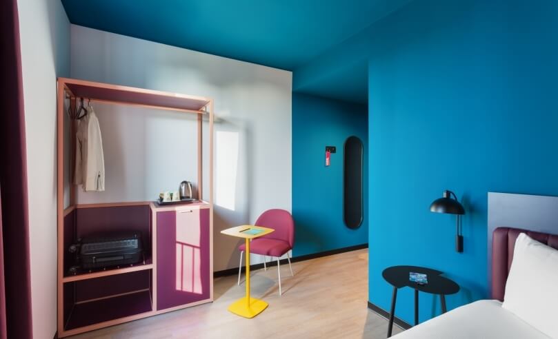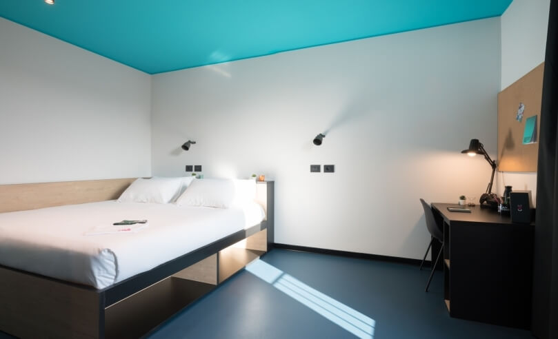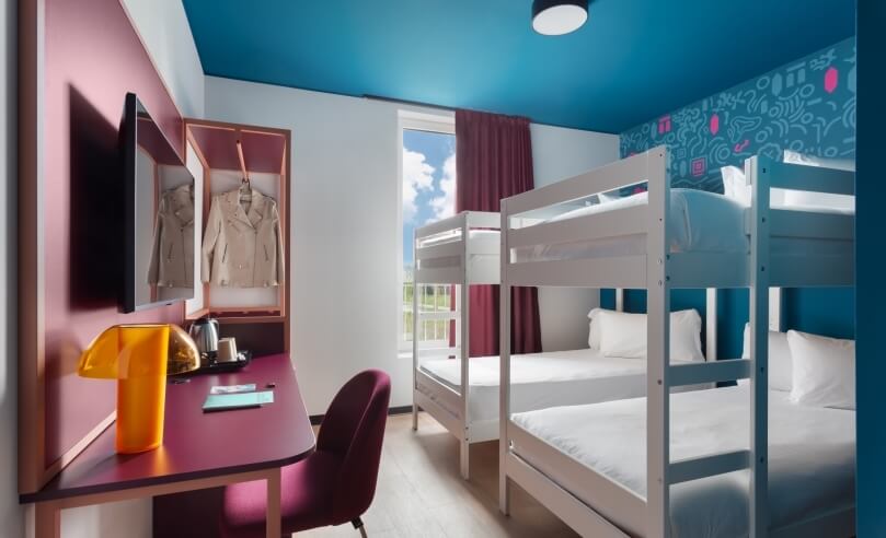 Two bunk beds with Simmons mattresses and pillows for impeccable comfort, a desk with coffee table and designer lamp, and an open wardrobe to keep everything organized. The ideal room for those traveling in a group or looking to share the experience with others, without giving up style and comfort.