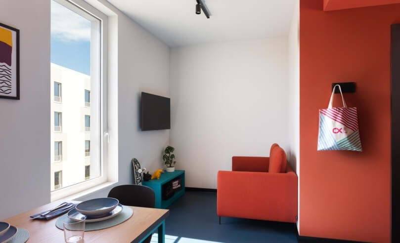 A spacious double bed with Simmons mattress and pillows for impeccable comfort, a functional desk for working in peace, and a modern kitchenette equipped with everything you need. The bright and cozy living area makes this room the perfect choice for those seeking freedom and comfort during their stay, whether alone or as a couple.