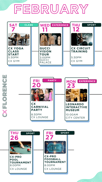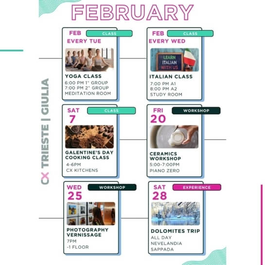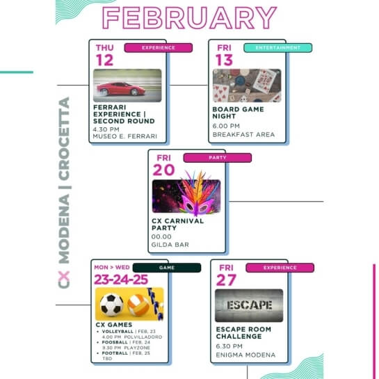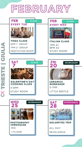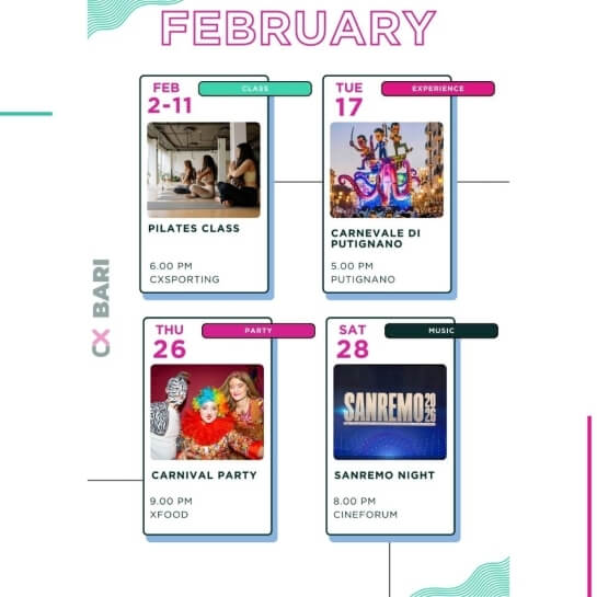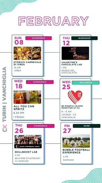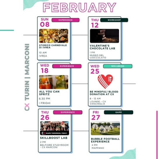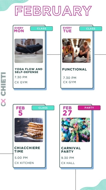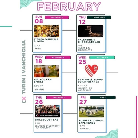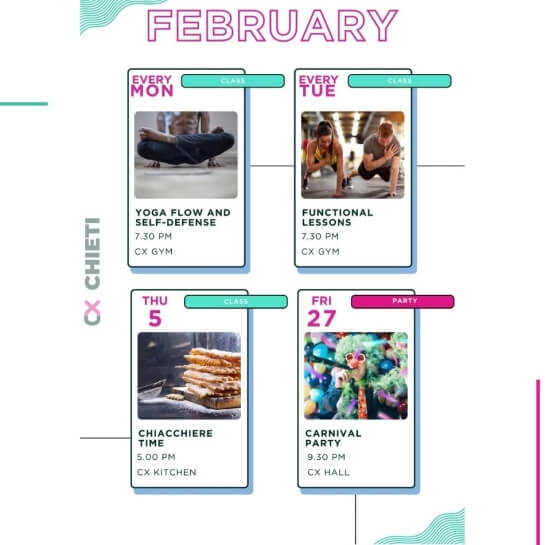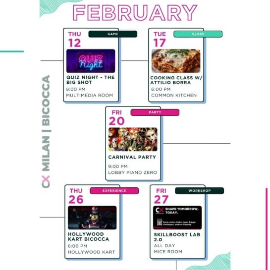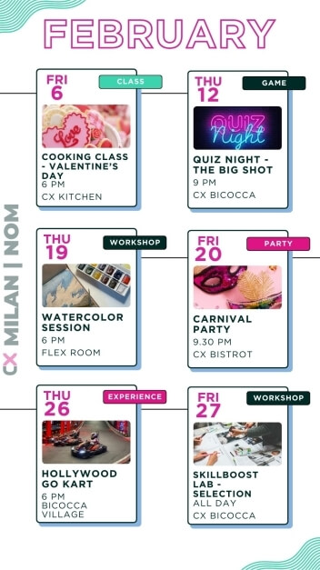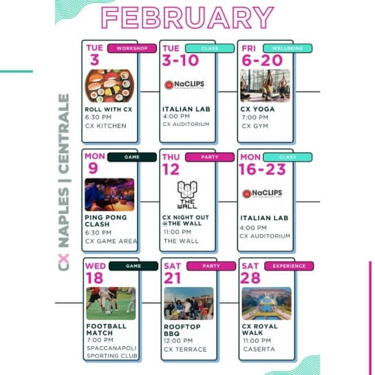 Eventi per tutti i gusti: party epici ma anche workshops, aperitivi, masterclass di gruppo, maratone di film, competizioni sportive e molto altro.