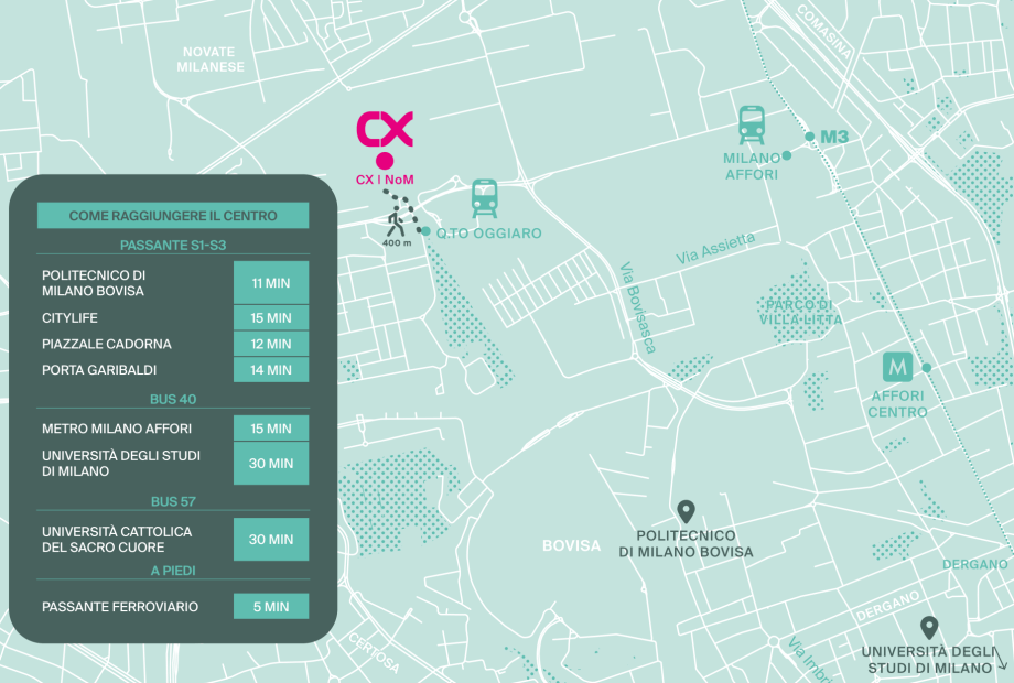 Located just 10 minutes from the University of Milan, CX Milan | NoM's location guarantees an absolute convenience experience! With the suburban regional train only 400 meters from the facility, getting to us is a breeze. Alternatively, you can enjoy a leisurely walk or bike ride along the pedestrian and bicycle path through the surrounding park. In close proximity to Novate and the former Expo area, a short walk from the Bovisa Polytechnic, CX Milan | NoM enjoys a strategic location for exploring all the attractions Milan has to offer. To make your commute even easier, we offer a free shuttle that conveniently connects you to the station.